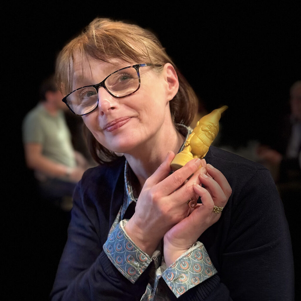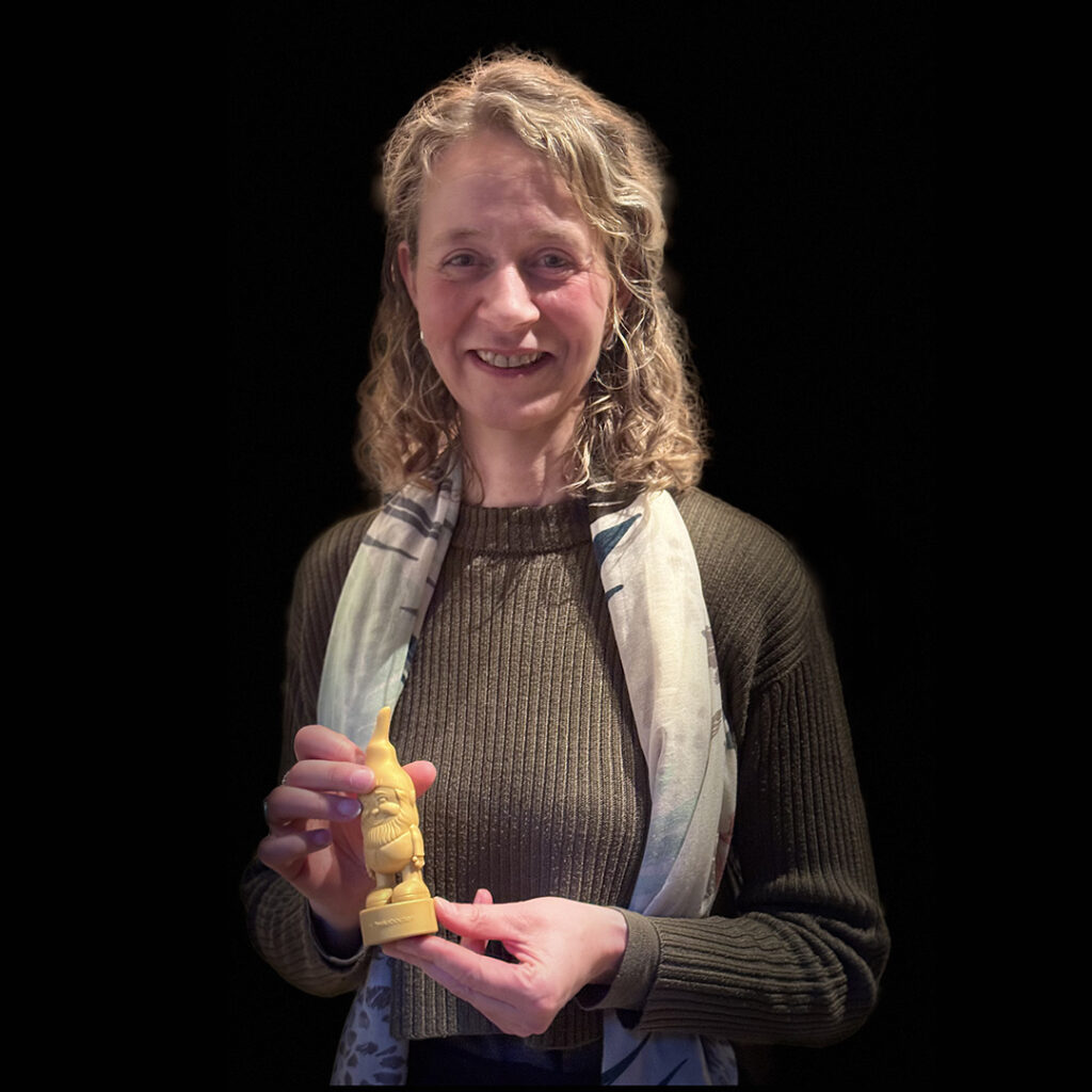 Hagar Roijackers, Gedeputeerde van de Provincie Noord Brabant in haar bedanken we voor de bijzondere ondersteuning die de Provincie aan het Bos verleent. Daarom ook voor haar een van de 100 Gouden Osskabouters als symbool voor het vele werk dat wordt verricht bij voor totstandkoming van het Bos.